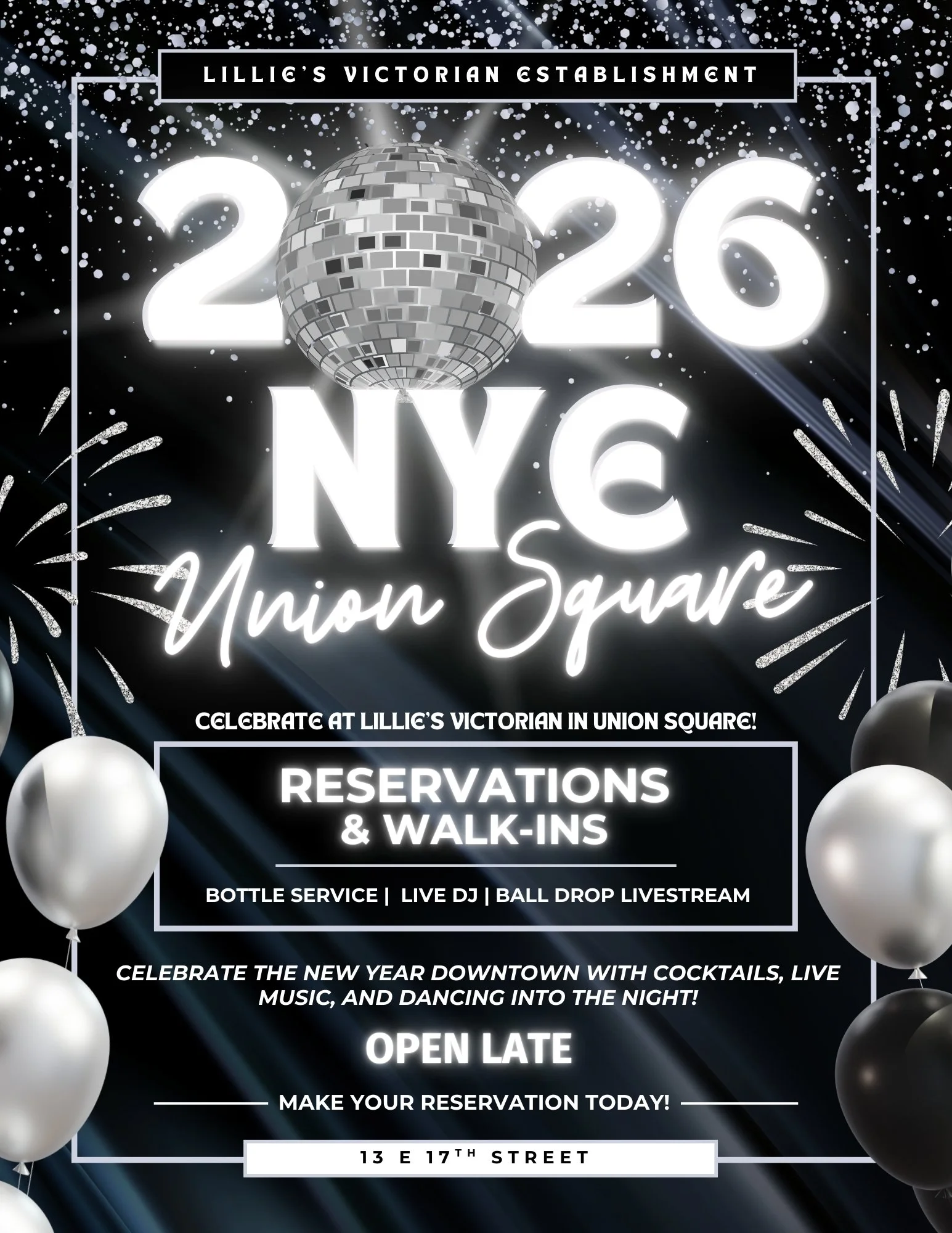 This New Year’s Eve, celebrate downtown in true New York fashion! Join us at Lillie’s UNION SQUARE for an incredible evening of Cocktails, Live Music, & Dancing as we count down to midnight! No Tickets. No overpriced tables. Simply make your RESERVATION online today! WALK-INS welcome all evening long.